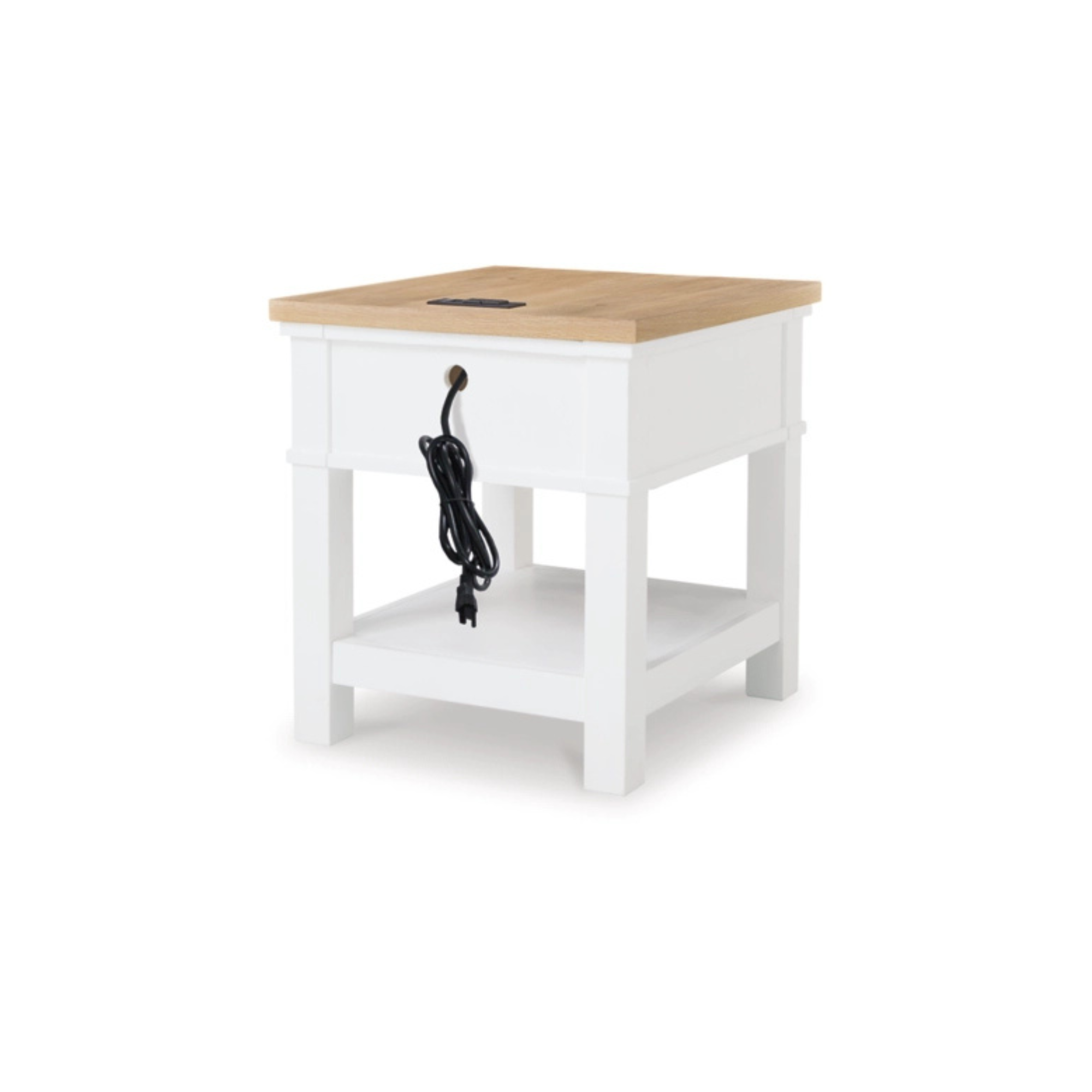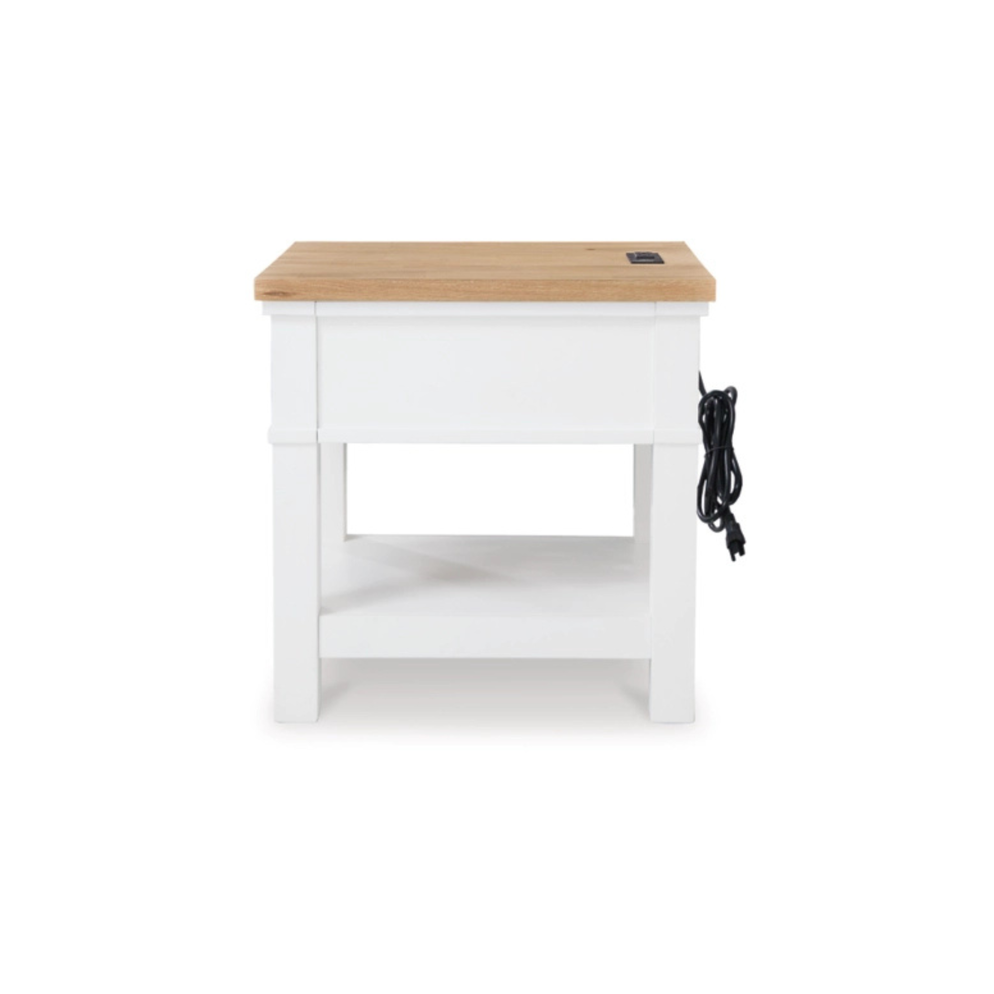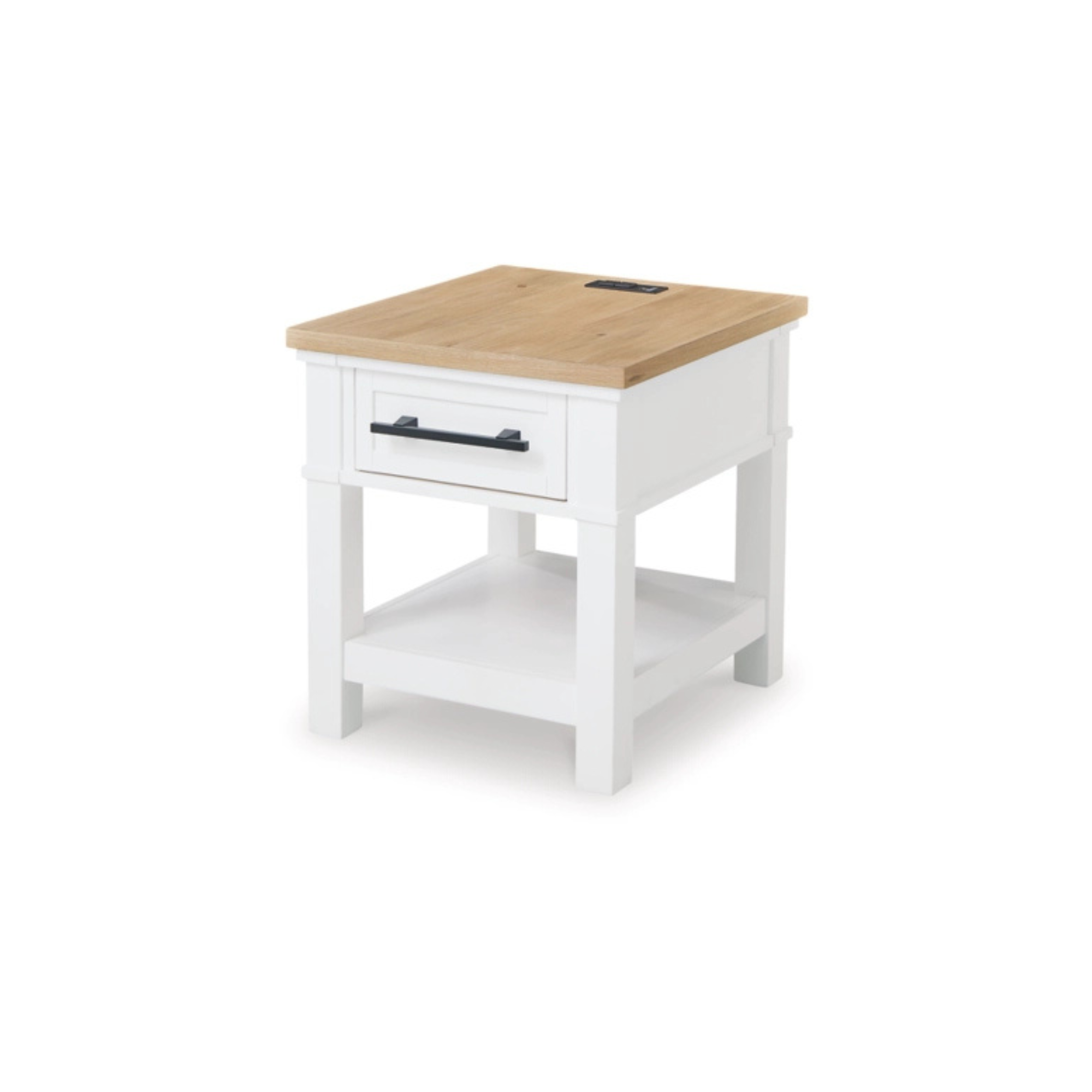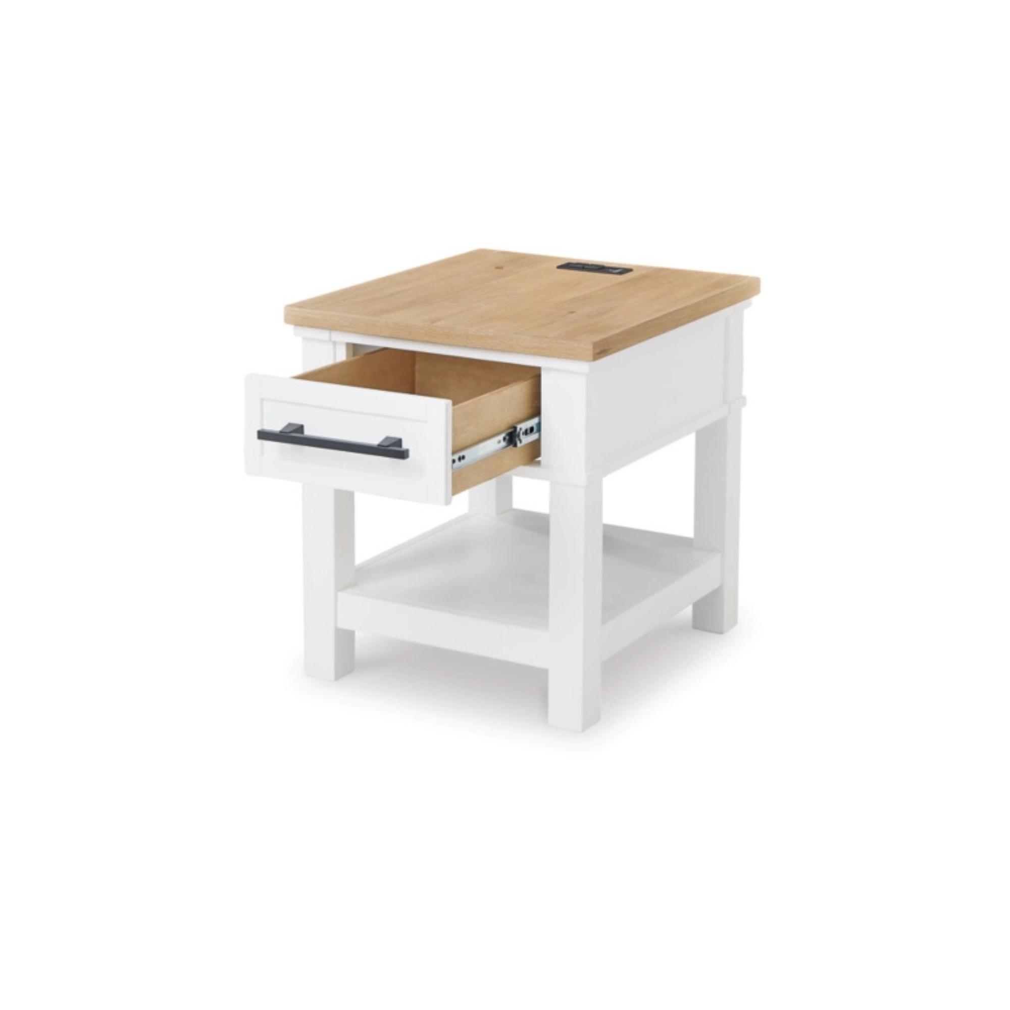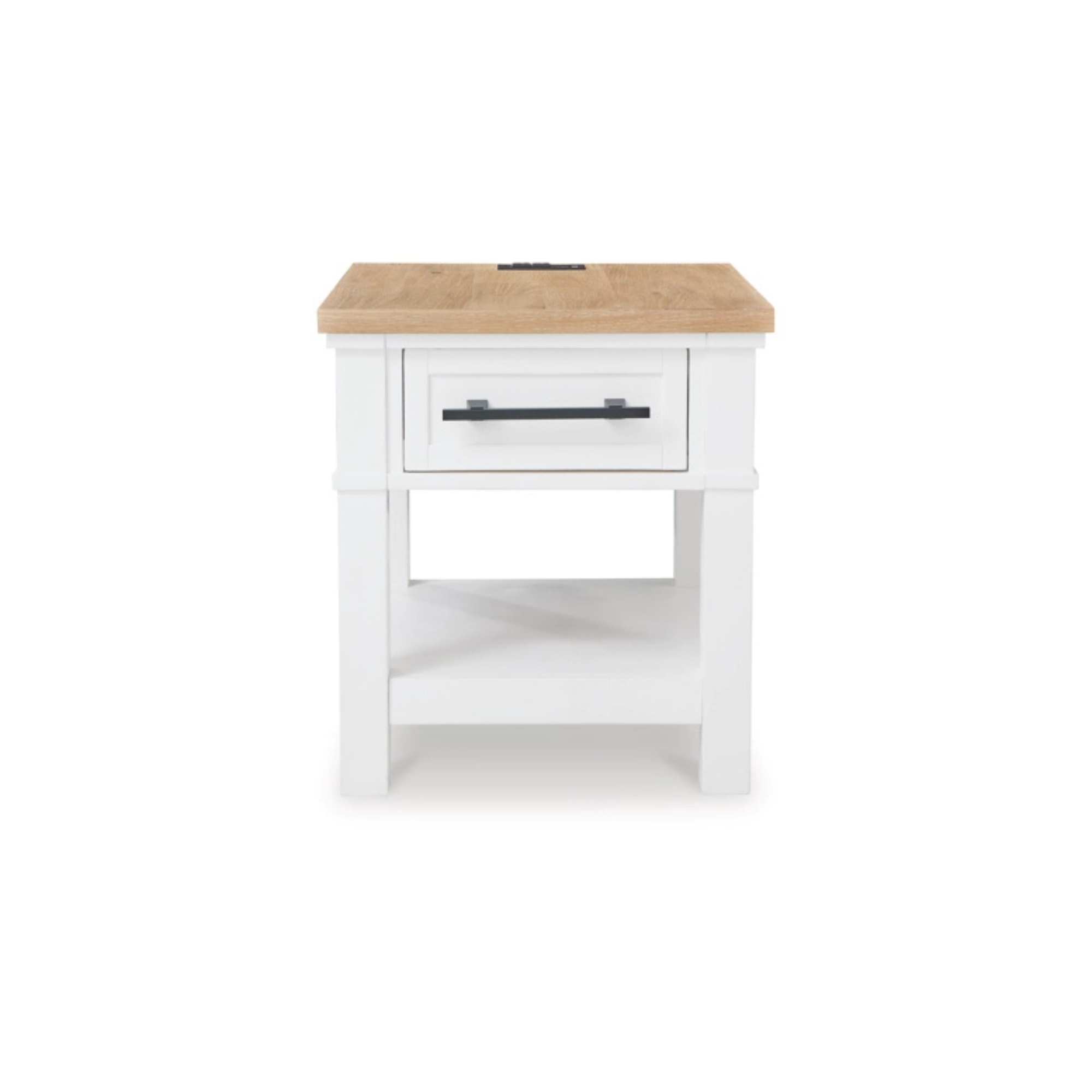 Ležeran stil s karakterom. Dvobojni Ashbryn pomoćni sto podiže ljestvicu udobnog i prijatnog dizajna. Čvrsta silueta s klasičnim bijelim finišem i crnim metalnim okovima odiše modernim rustičnim šarmom. Gornja ploča s izgledom mesarske daske od hrastovog furnira donosi opuštenu estetiku. A uz jednu fioku i donju policu, ovaj pažljivo osmišljeni komad omogućava vam da predmete izložite ili diskretno sklonite.