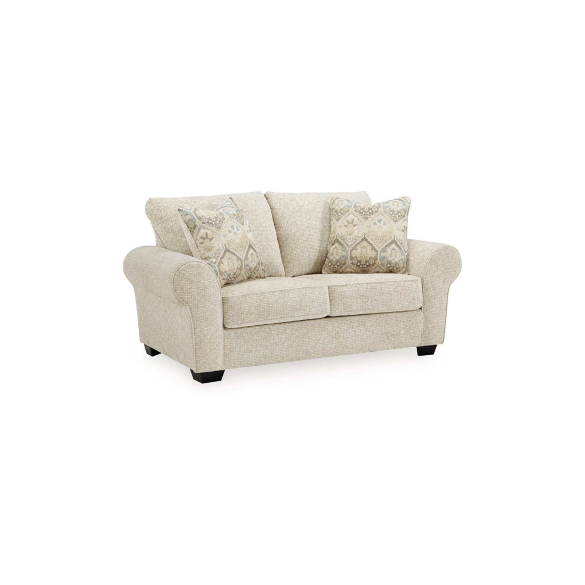 Spajajući klasične elemente poput raskošnih širokih rukohvata, precizno izrađenih jastuka u obliku kutije i suženih crnih nogu za moderan izgled, Haisley dvosjed odiše prijelaznim stilom koji se savršeno uklapa u svaki dom. Ovaj prostrani dvosjed pruža dovoljno mjesta za udobnost svih korisnika, a presvučen je mekom, grubom tkaninom bogatom teksturom. Svijetla i lijepa boja slonovače doprinosi laganoj i ugodnoj atmosferi.