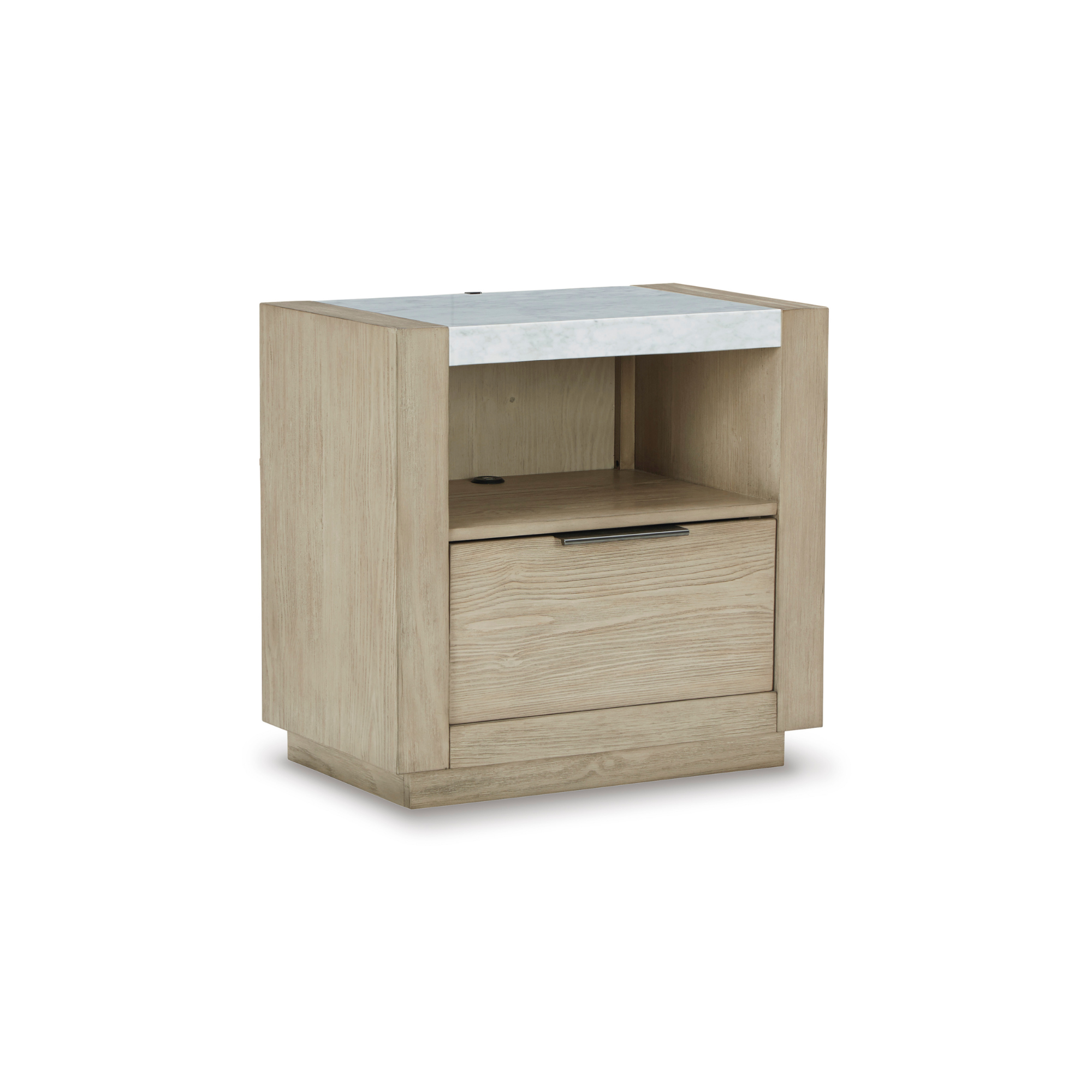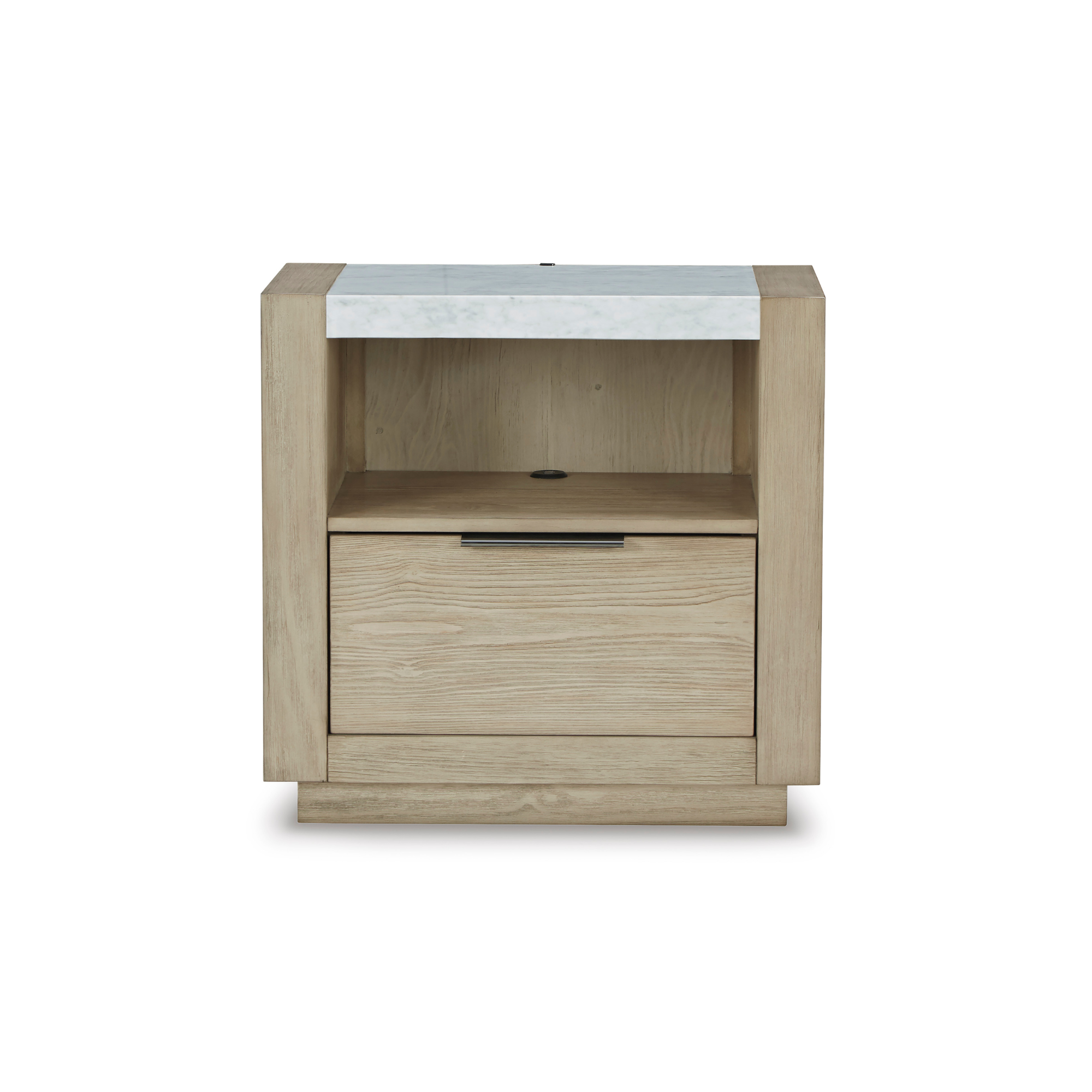 Postignite luksuzni, moderni izgled koji volite po cijeni koju možete priuštiti. Noćni ormarić Hennington odlikuje se izraženom siluetom na postolju koje ovaj komad namještaja uzdiže do pravog modernog remek-djela. Ima složen, ali svestran dvobojni izgled zahvaljujući prirodnom mramornom vrhu i teksturiranoj površini u boji biskvita. Otvorena polica i fioka s funkcijom samostalnog zatvaranja i ručkom u boji nikla pružaju taman toliko prostora za odlaganje. Noćni ormarić spaja tehnologiju i čiste linije dizajna s LED noćnim svjetlom koje osvjetljava postolje s tri strane. Dvostruki USB priključak za punjenje, smješten u području otvorene police, dodaje dodatnu funkcionalnost.
