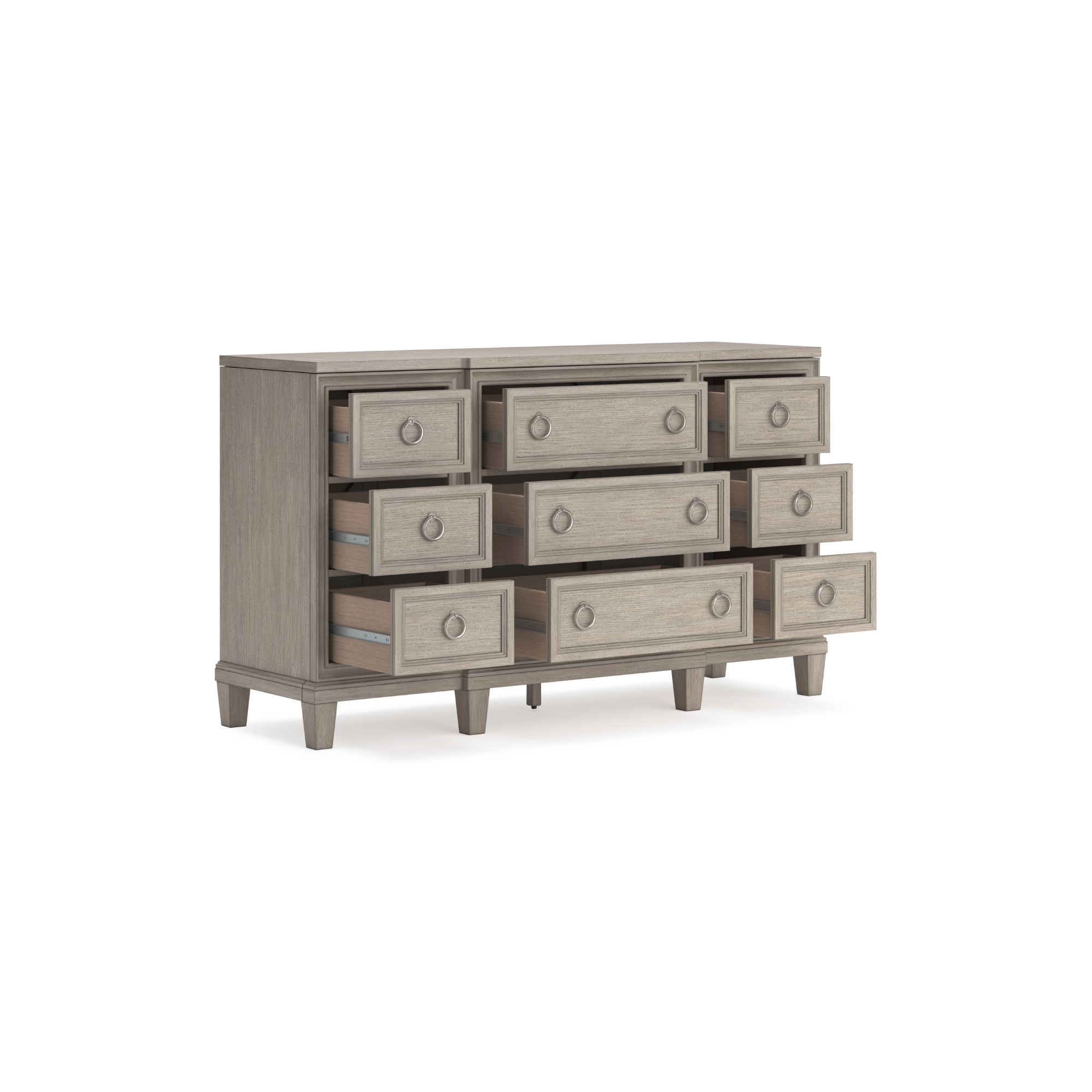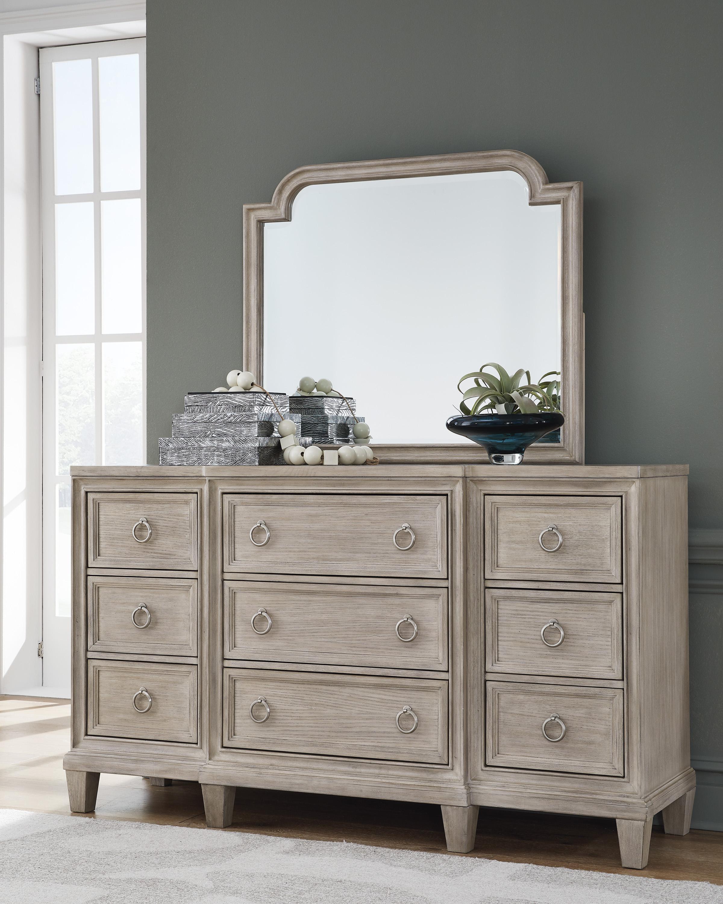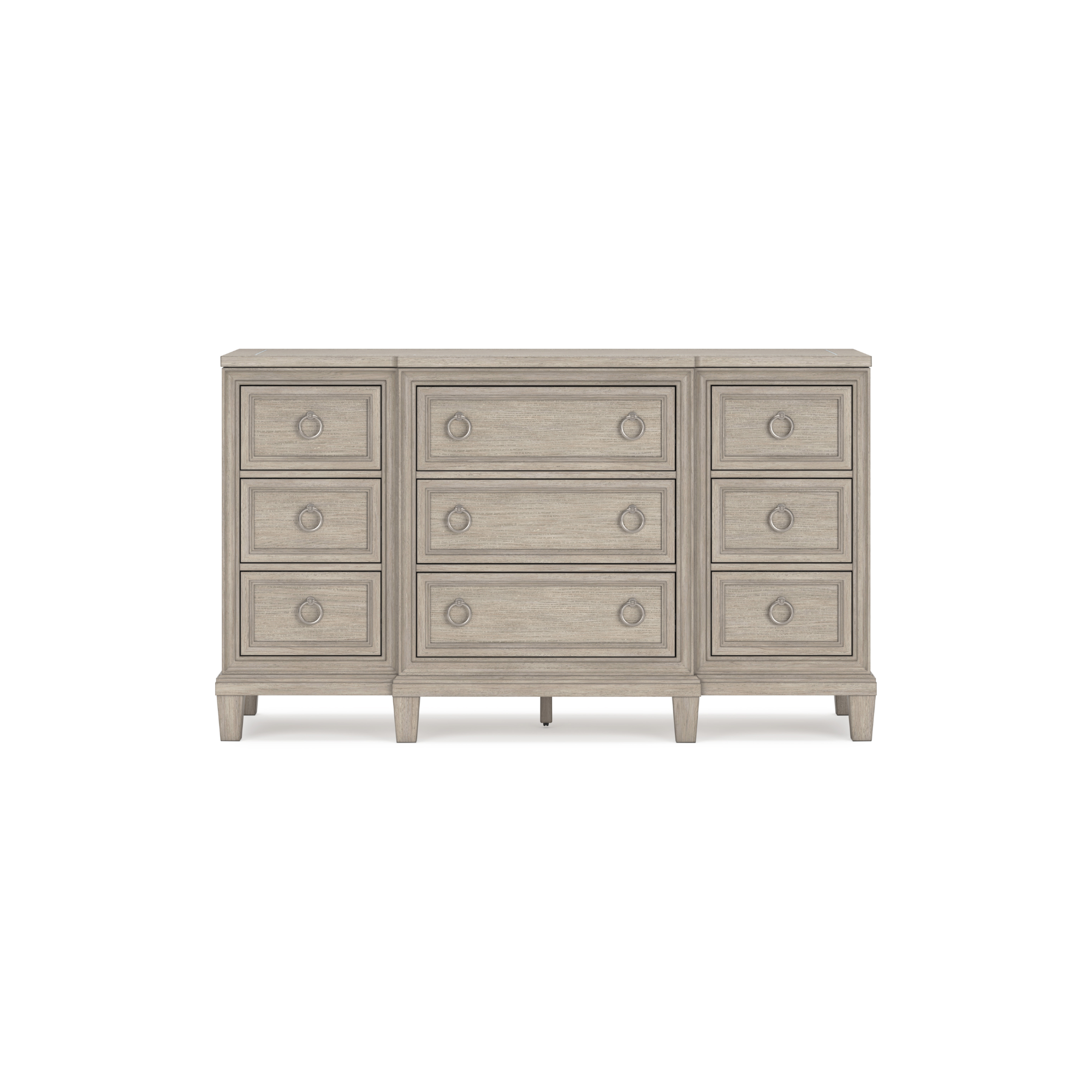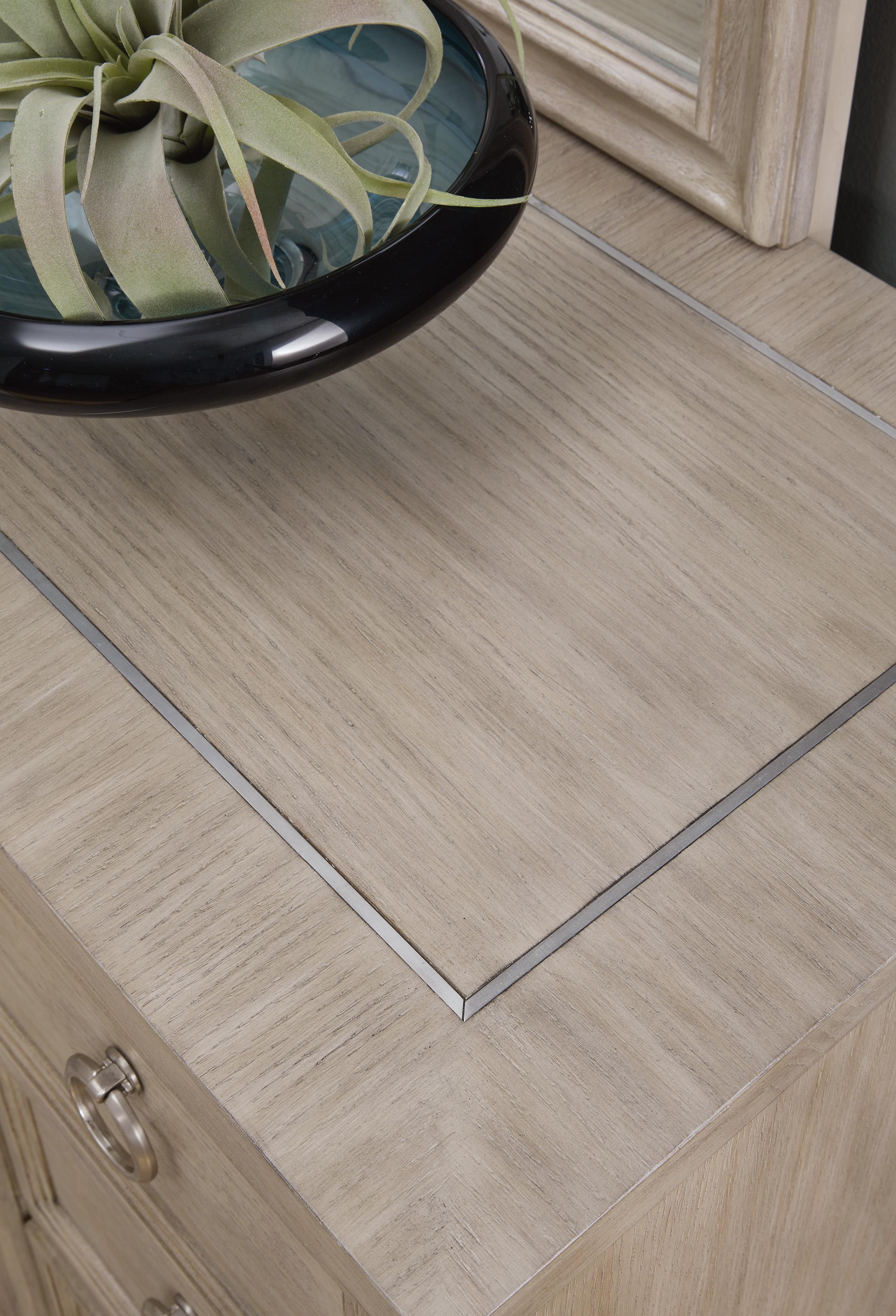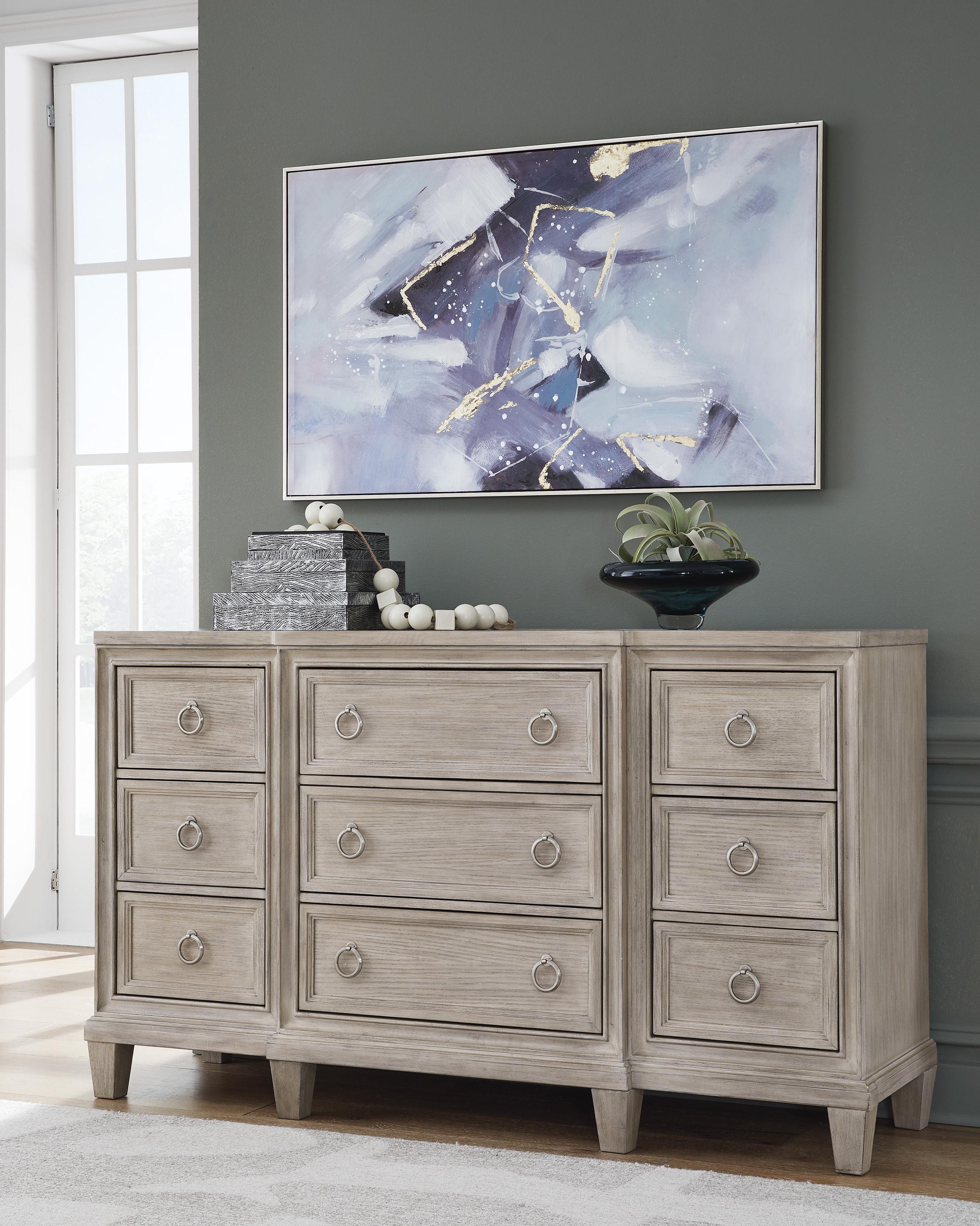 Impozantna komoda Jorlaina jednako dobro izgleda u tradicionalnim kao i u modernim prostorima. Svježi svijetlosivi finiš pruža ležeran, moderan izgled. Prostrane ladice imaju ukrasne okvire i ručke u satenskom niklovanom tonu, za čist, ali sofisticiran dizajn. U kombinaciji s elegantnim metalnim okvirom na vrhu, ovo je sjajan modni detalj koji će oživjeti vašu spavaću sobu.