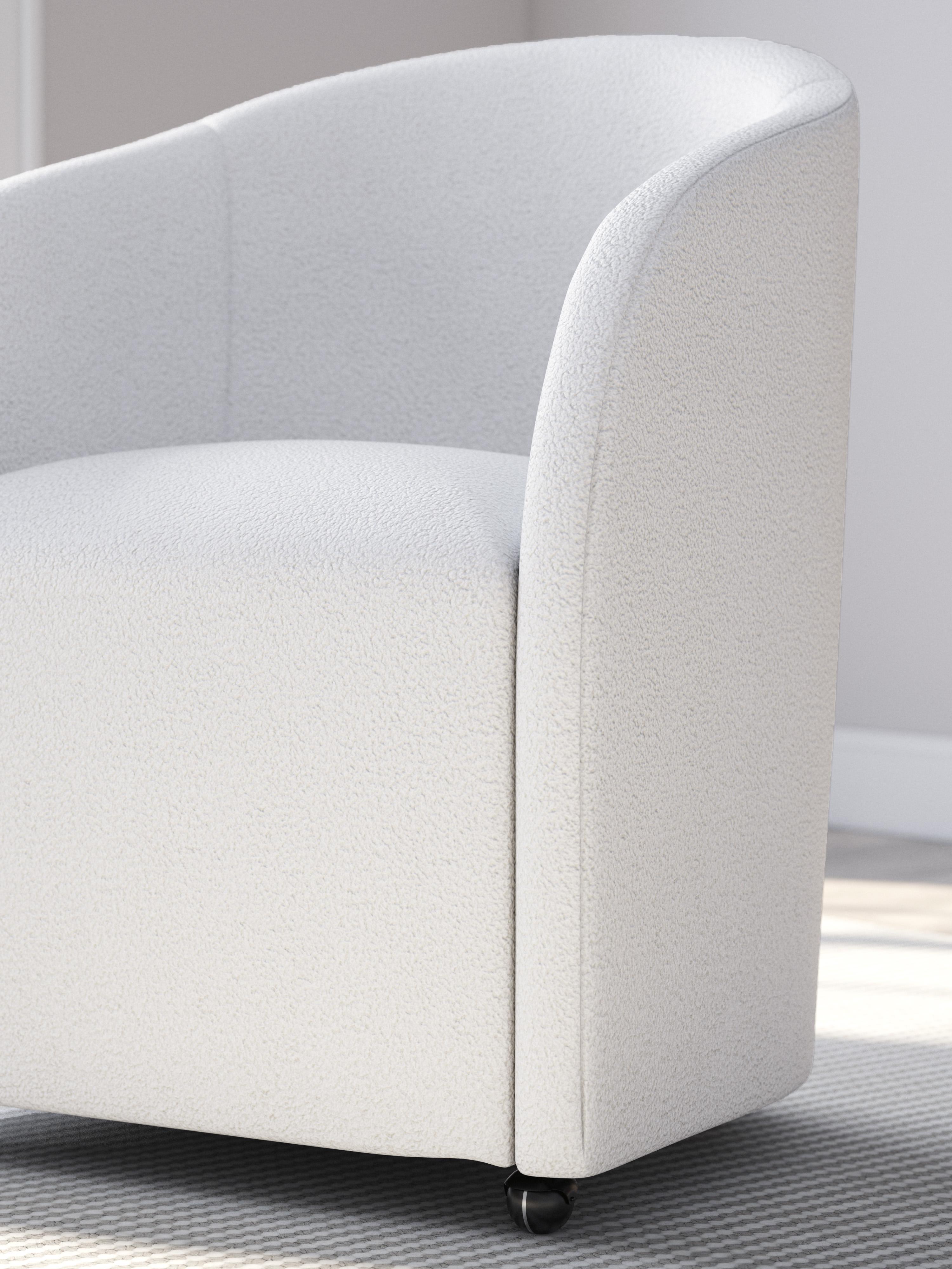 Potpuno tapacirana Korestone kancelarijska stolica ostavlja snažan utisak na jednostavno zadivljujući način. Njene predivne linije naglašene su neutralnim boucle tkaninom koja je izuzetno ugodna za oko. Ova stolica s udubljenjem je komad koji ste tražili da unaprijedite svoj savremeni kućni ured. Osim toga, postavljena je na točkiće, što je čini lako pokretnom.