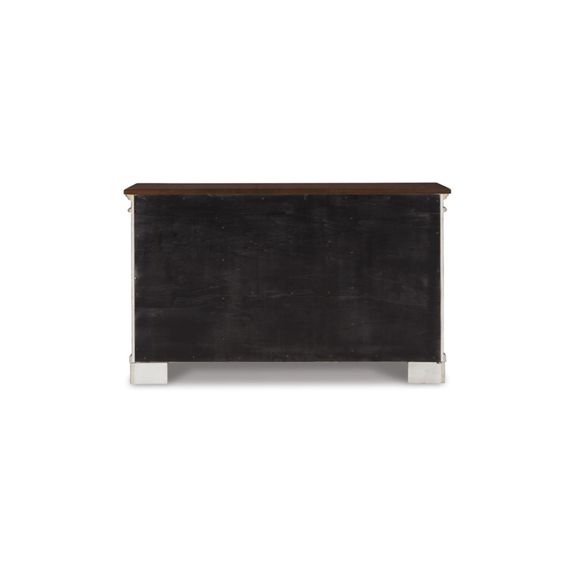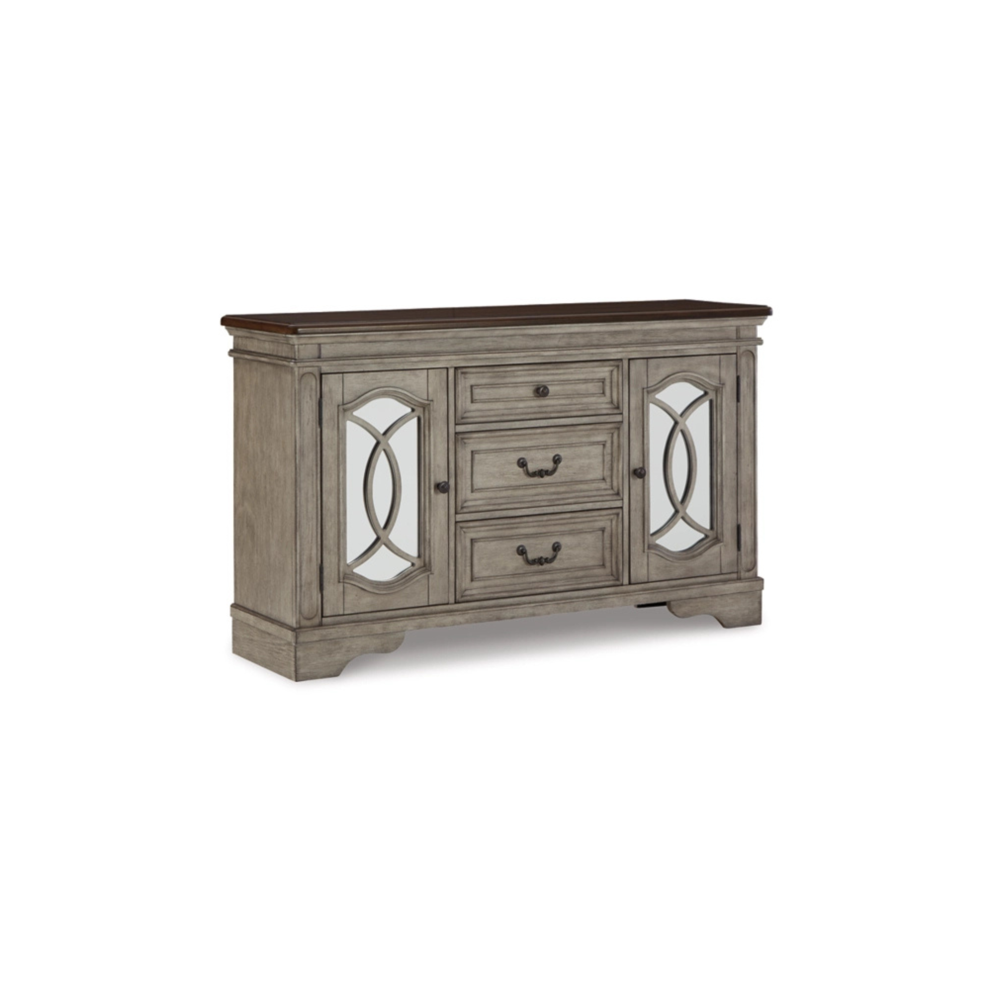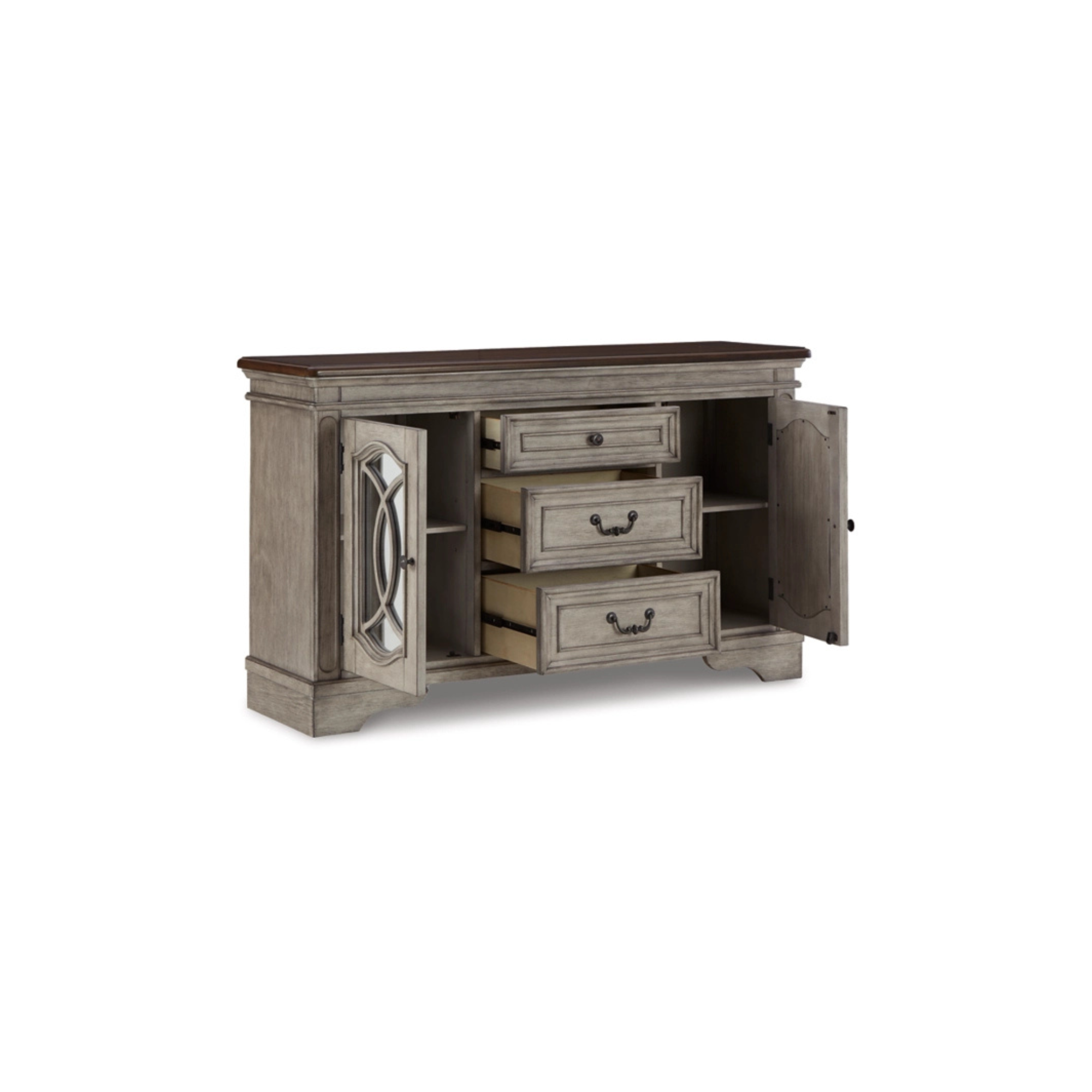 Poslužite osjećaj tradicionalnog rustičnog dizajna uz Lodenbay ormarić za trpezariju. Ima dva ormarićna vrata s umetnutim ogledalom i dekorativnim rezbarijama. Tri fioke ormarića, sa glatkim klizanjem, čvrstom spojnicom i crnim filcom na dnu, idealne su za čuvanje osjetljivijih predmeta. Starinski sivo obojeno tijelo i bogata tamno orahova ploča, zajedno sa ručkama i dugmadima u tamno bronzanoj boji, zaokružuju prekrasan dizajn.