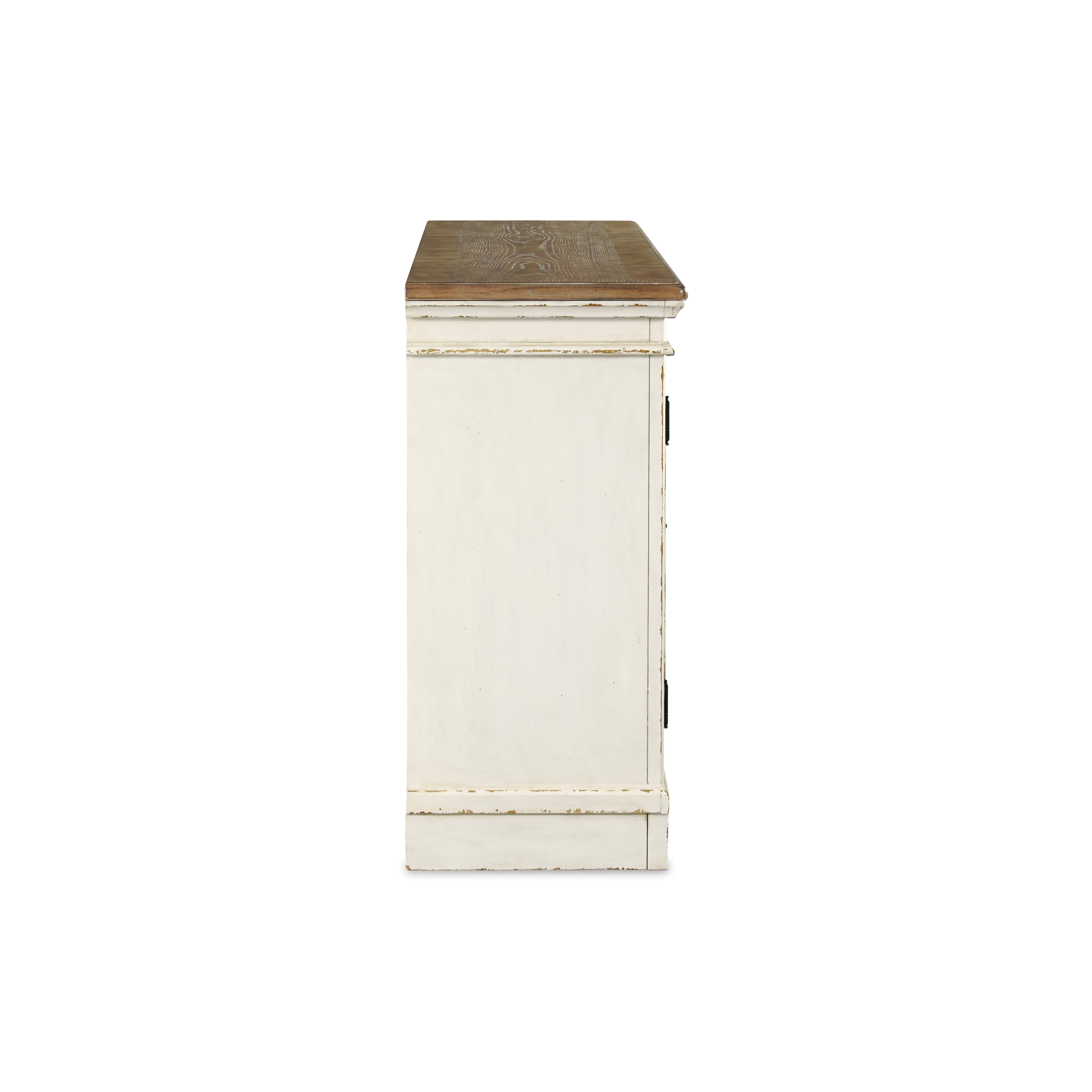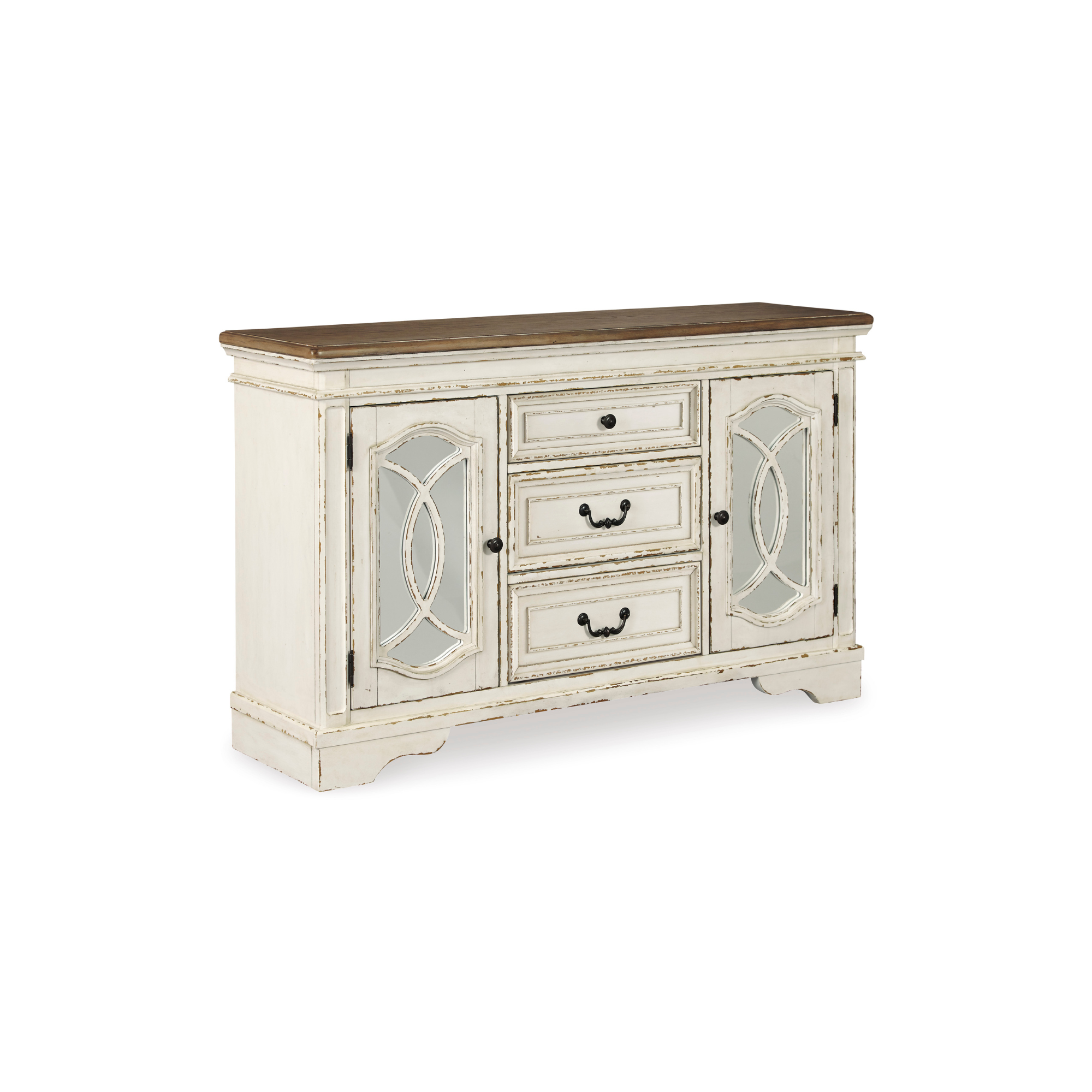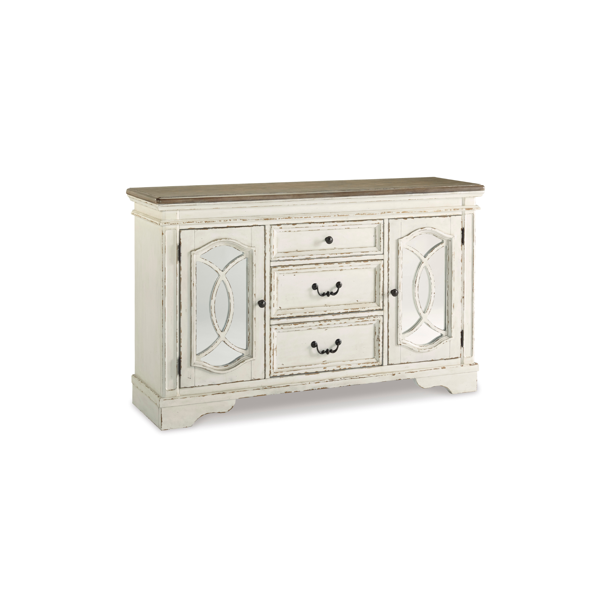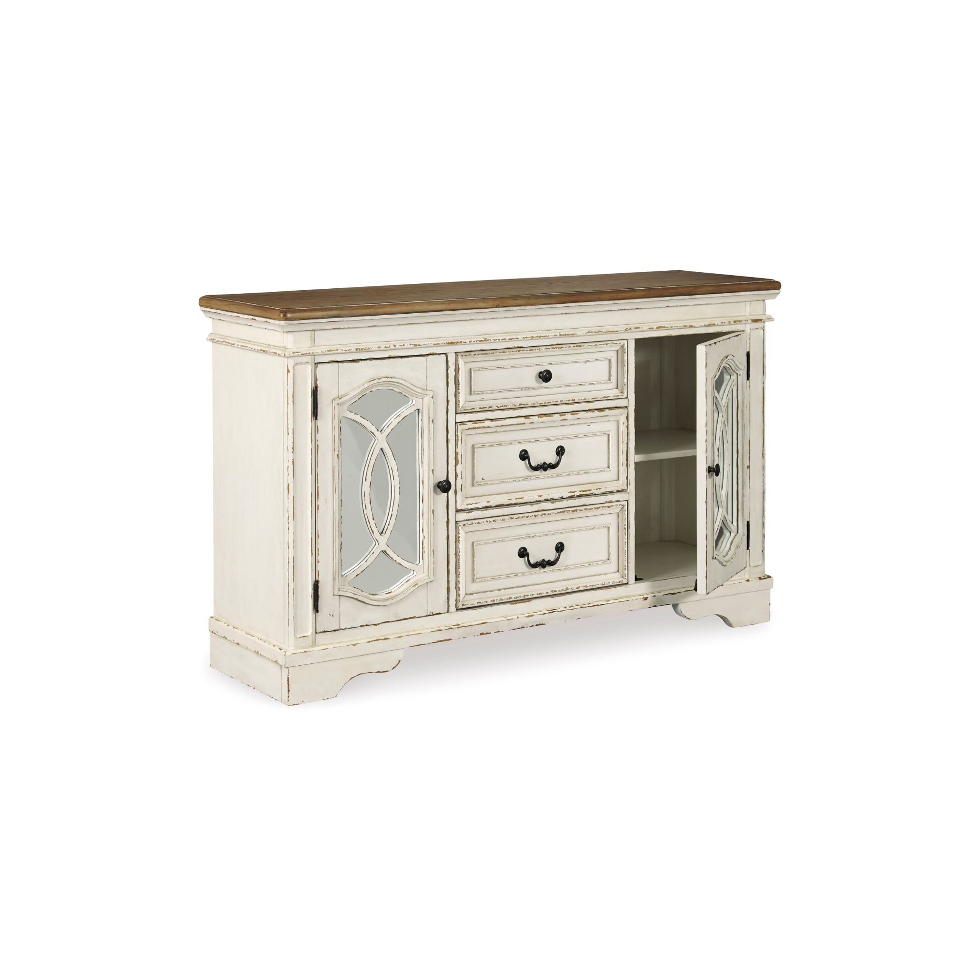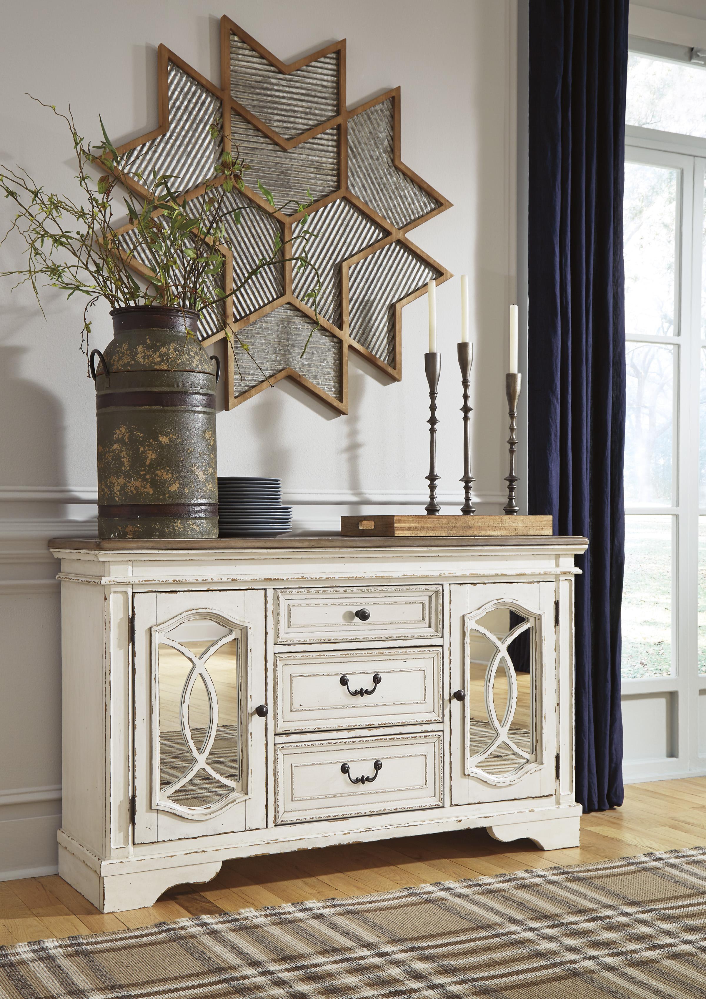 Poslužite gozbu za oči inspirisanu francuskim seoskim stilom uz Realyn ormarić za trpezariju. Jedinstveni detalji uključuju prostor za odlaganje iza ormarićnih vrata ukrašen dekorativnim rezbarijama preko ogledala, te dvobojnu, šarmantnu kombinaciju izlizane bijele boje i gornje ploče s efektom starog drveta.