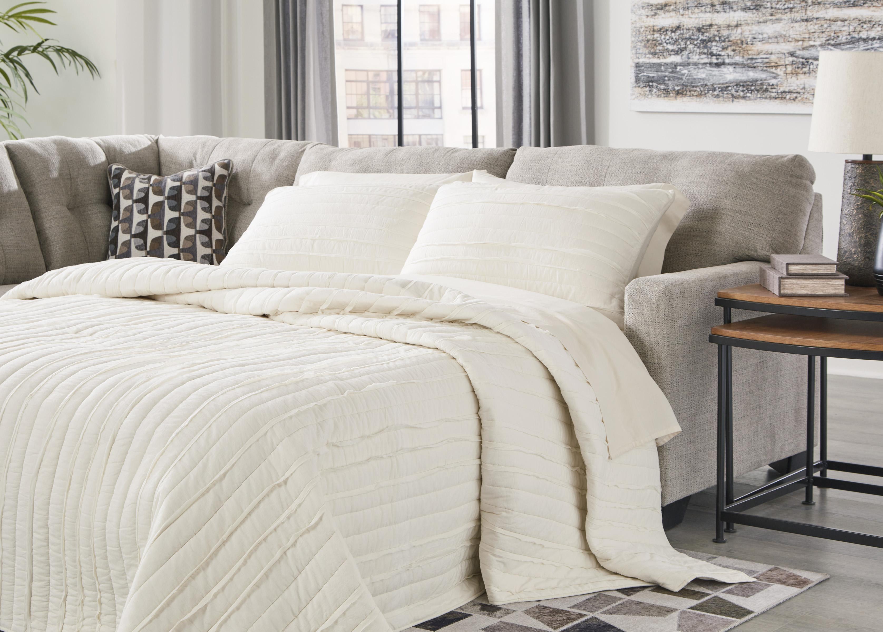 Pouzdana udobnost, u novom ruhu. Prikladna za različite prostore, Mahoney ugaona garnitura s ležajem i ležaljkom (chaise) poziva vas da prigrlite pristupačan, svakodnevan stil. Vješto spaja klasične detalje, poput prošivenog naslona, s modernom formom. Ugrađeni ležaj na razvlačenje pune veličine stavlja funkcionalnost u prvi plan. Mekana i višetonirana tkanina dodatno doprinosi opuštenom i udobnom osjećaju koji ova pametno dizajnirana garnitura pruža.