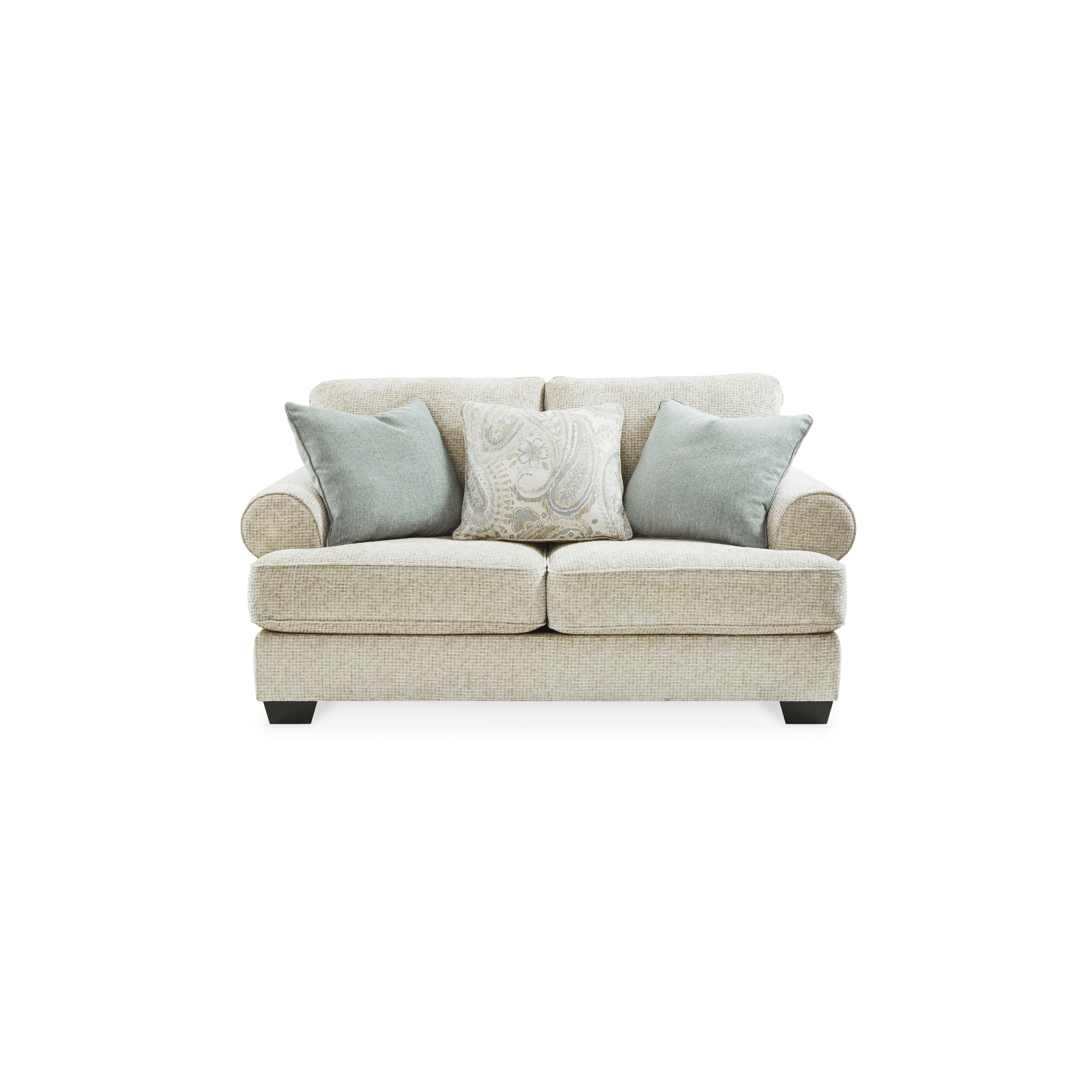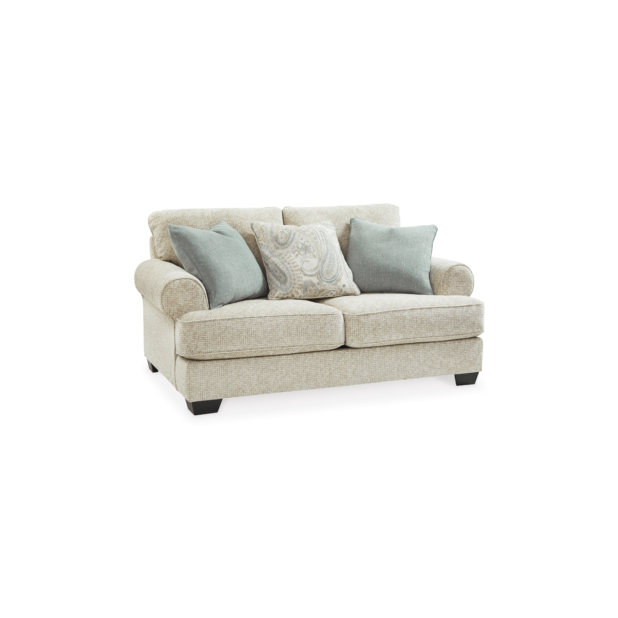 Dvosjed Monaghan postiže prelijepu ravnotežu između klasičnog i modernog. Njegovi tradicionalni elementi uključuju T-jastučno sjedište i povučene okrugle naslone za ruke, zakrivljene za moderan šarm. Elegantni jastuci u bojama spa magle i žakard paisley uzoraka donose suptilan, smiren kontrast ležernom teksturiranom chenille tapaciranju dvosjeda. Izbor u boji pješčanog bež stvara svjež i prelijep stil koji oživljava prostor.