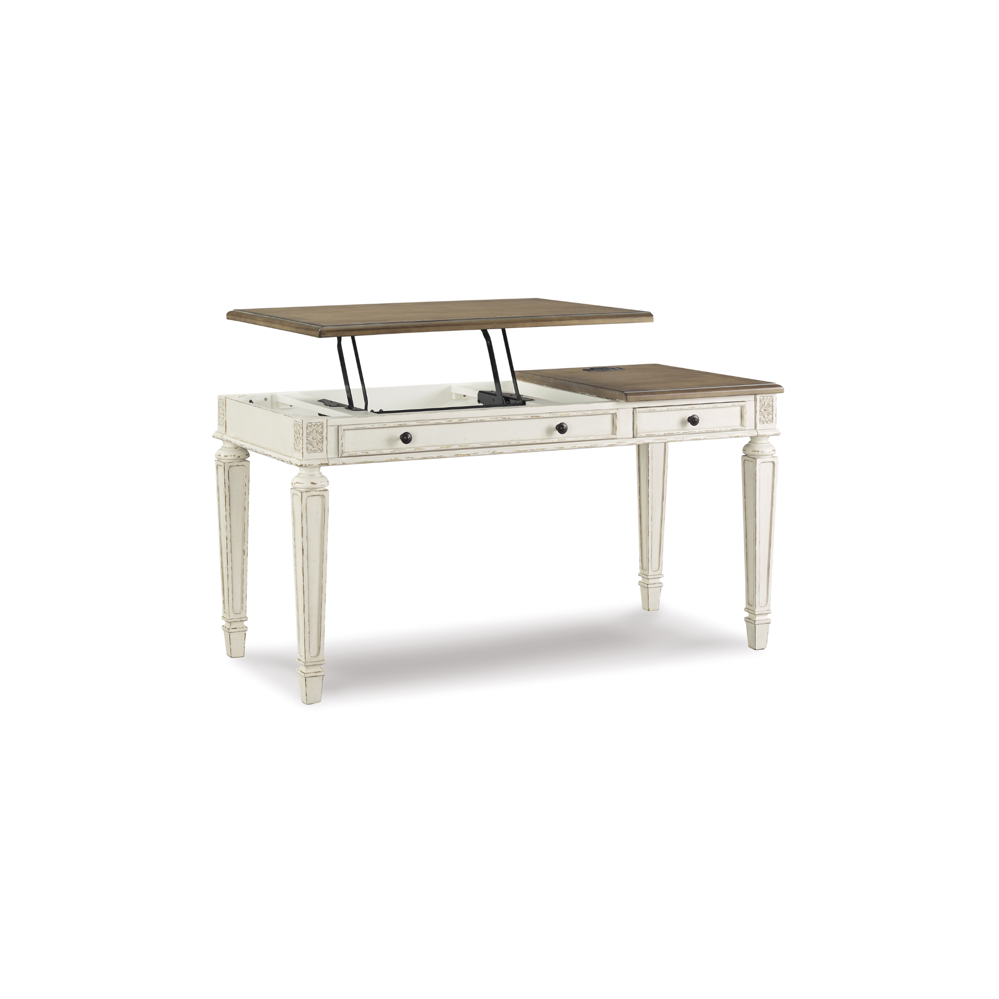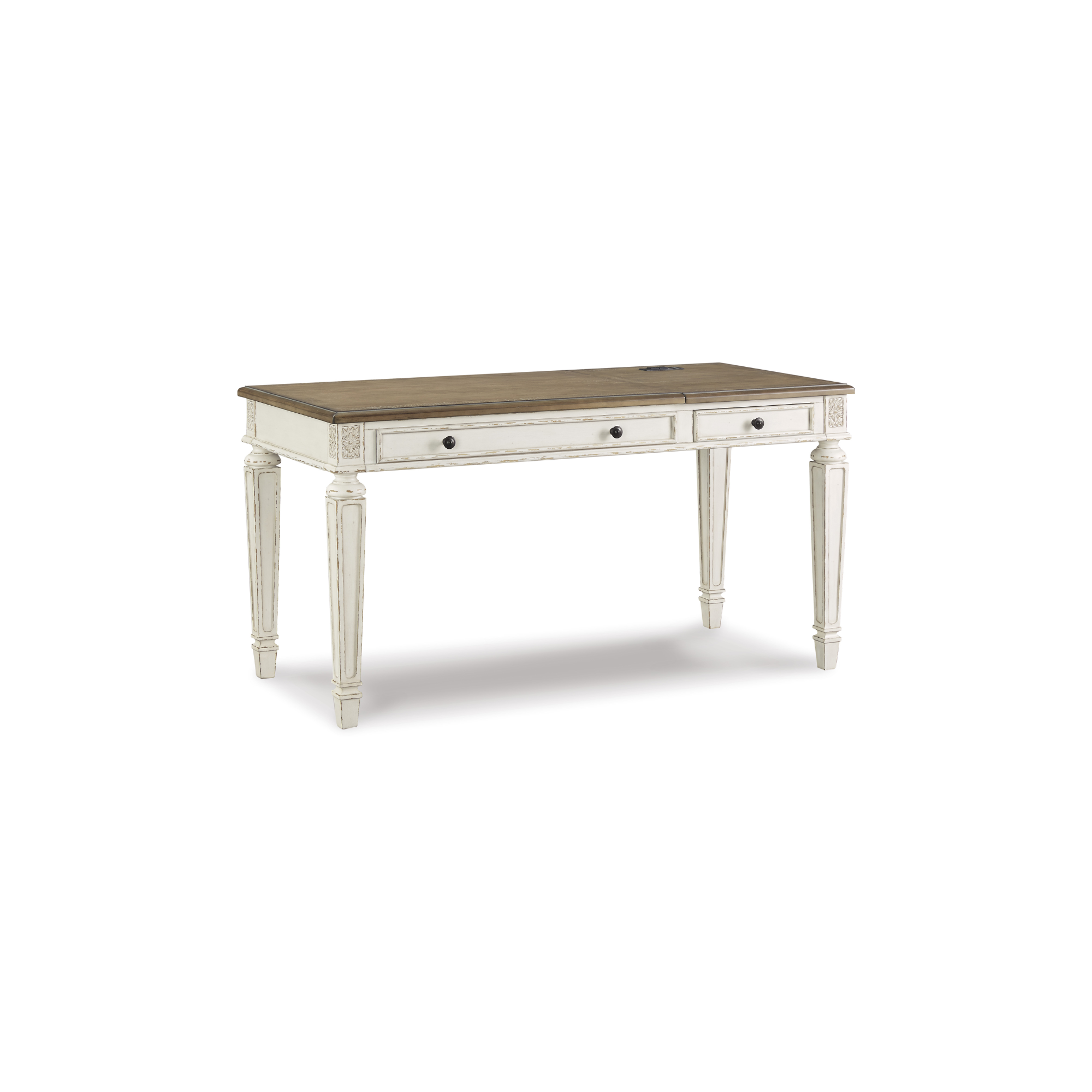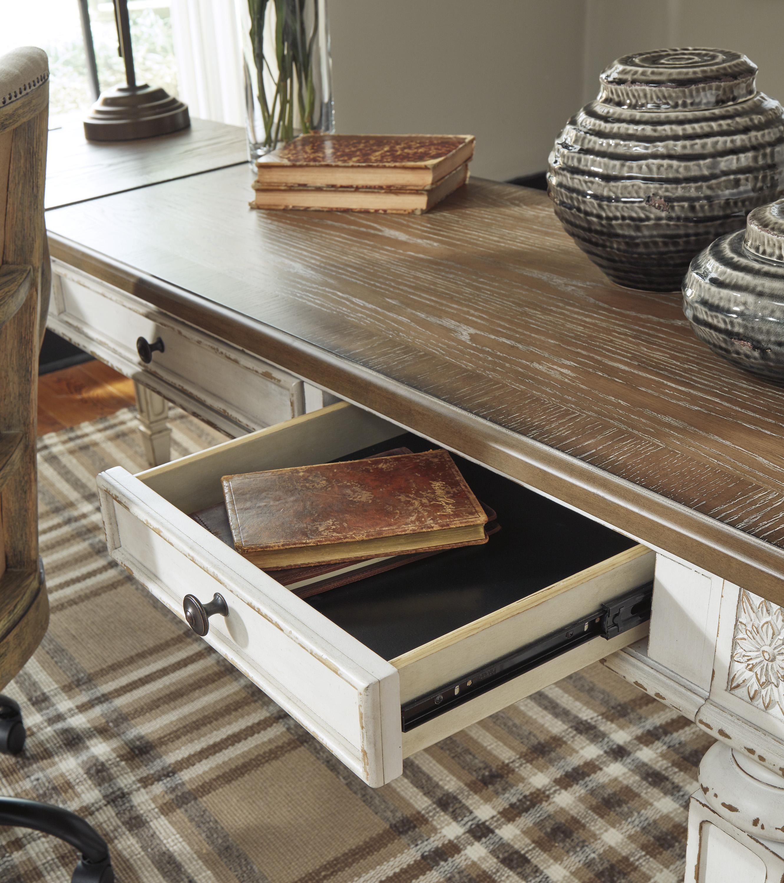 Uzdignut na viši nivo tradicionalnog seoskog stila, Realyn radni sto predstavlja ostvarenje vašeg savršenog kućnog ureda. Njegova antikna dvobojna estetika spaja izbijeljenu bijelu s izblijedjelim drvenim tonom na vrhu za dodatni šarm. Uokvirene fronte ladica, dekorativni nosači i elegantno okrenute, sužene noge unose dozu profinjenosti, dok tamni bronzani rukohvati daju klasičan dodir.