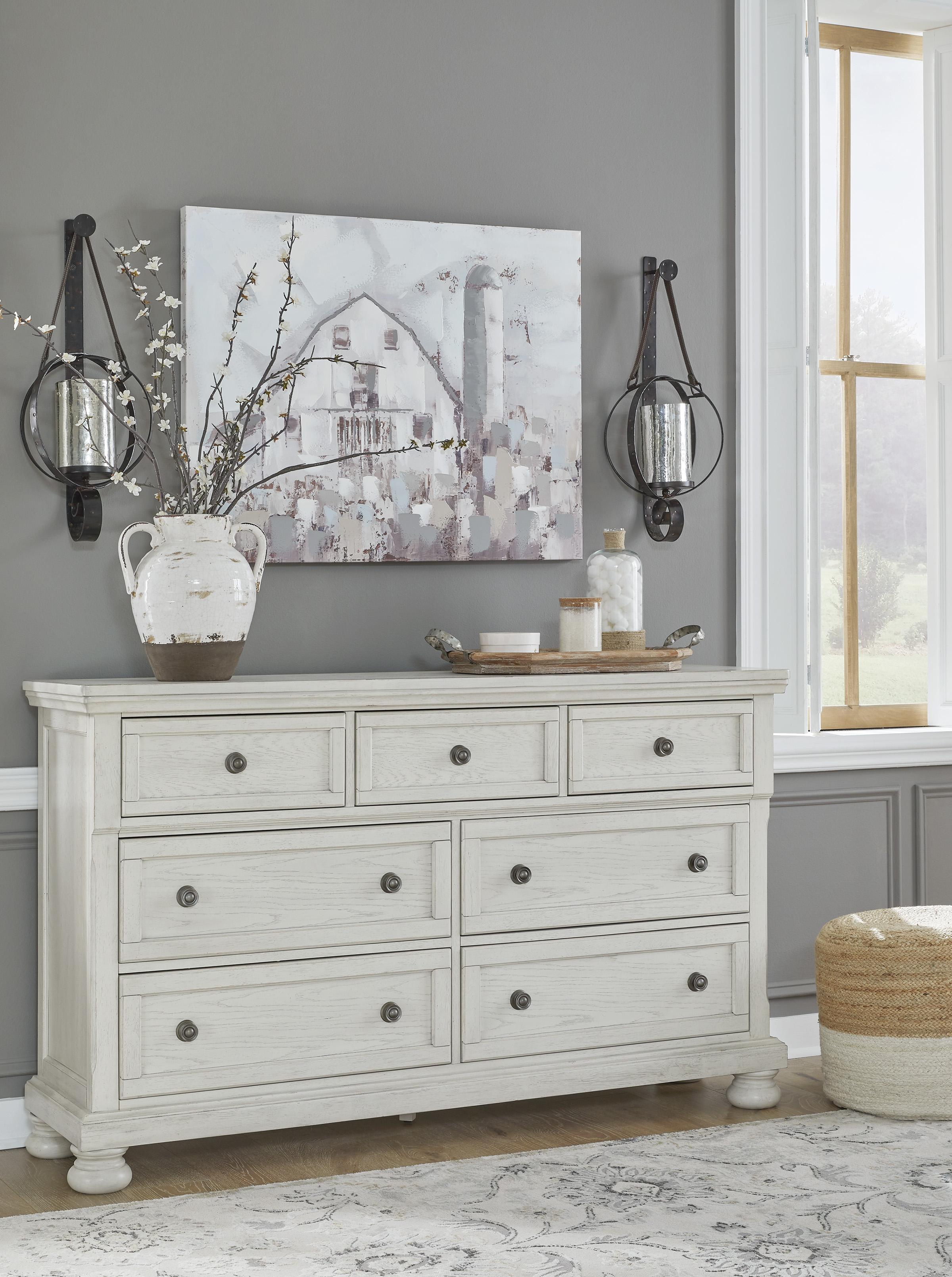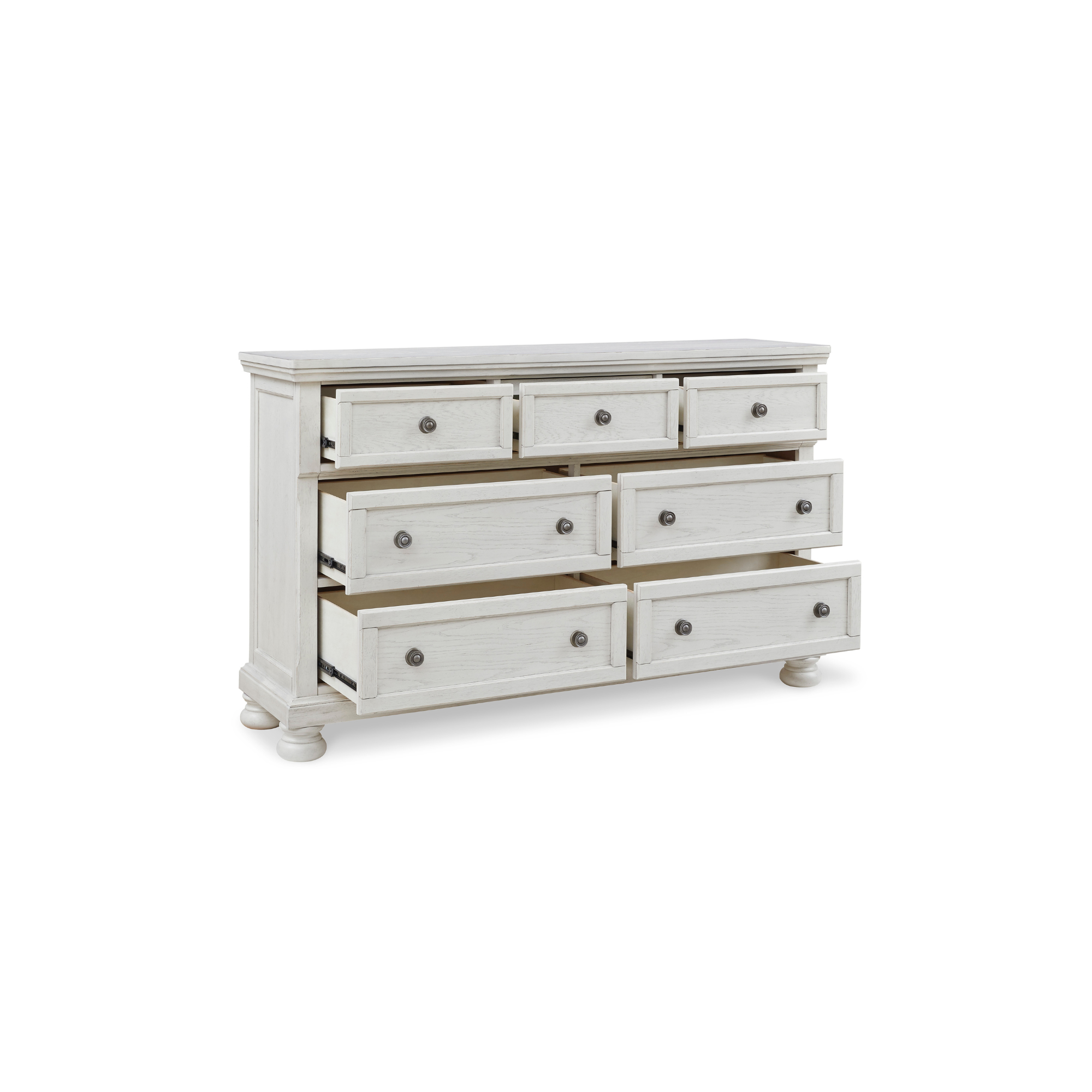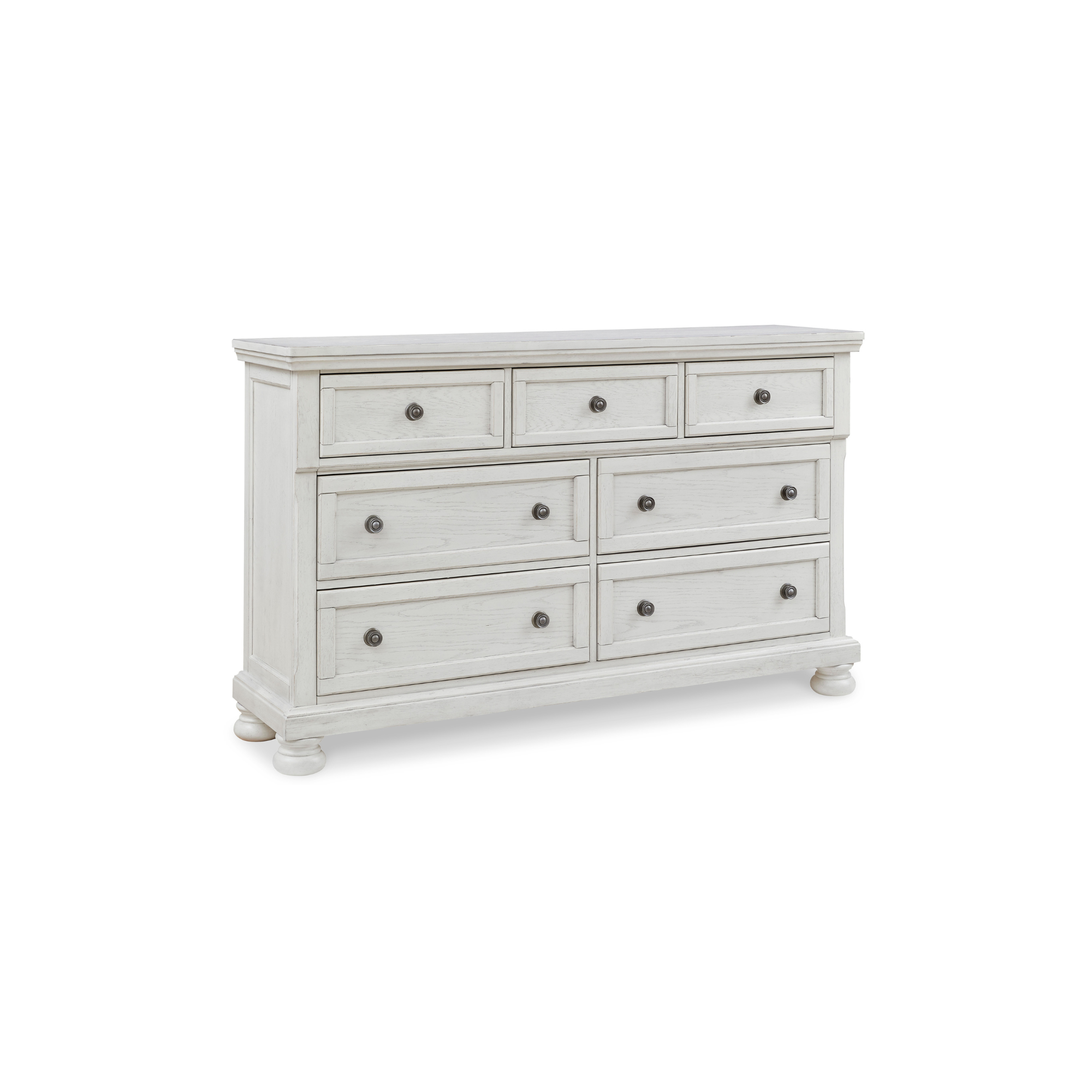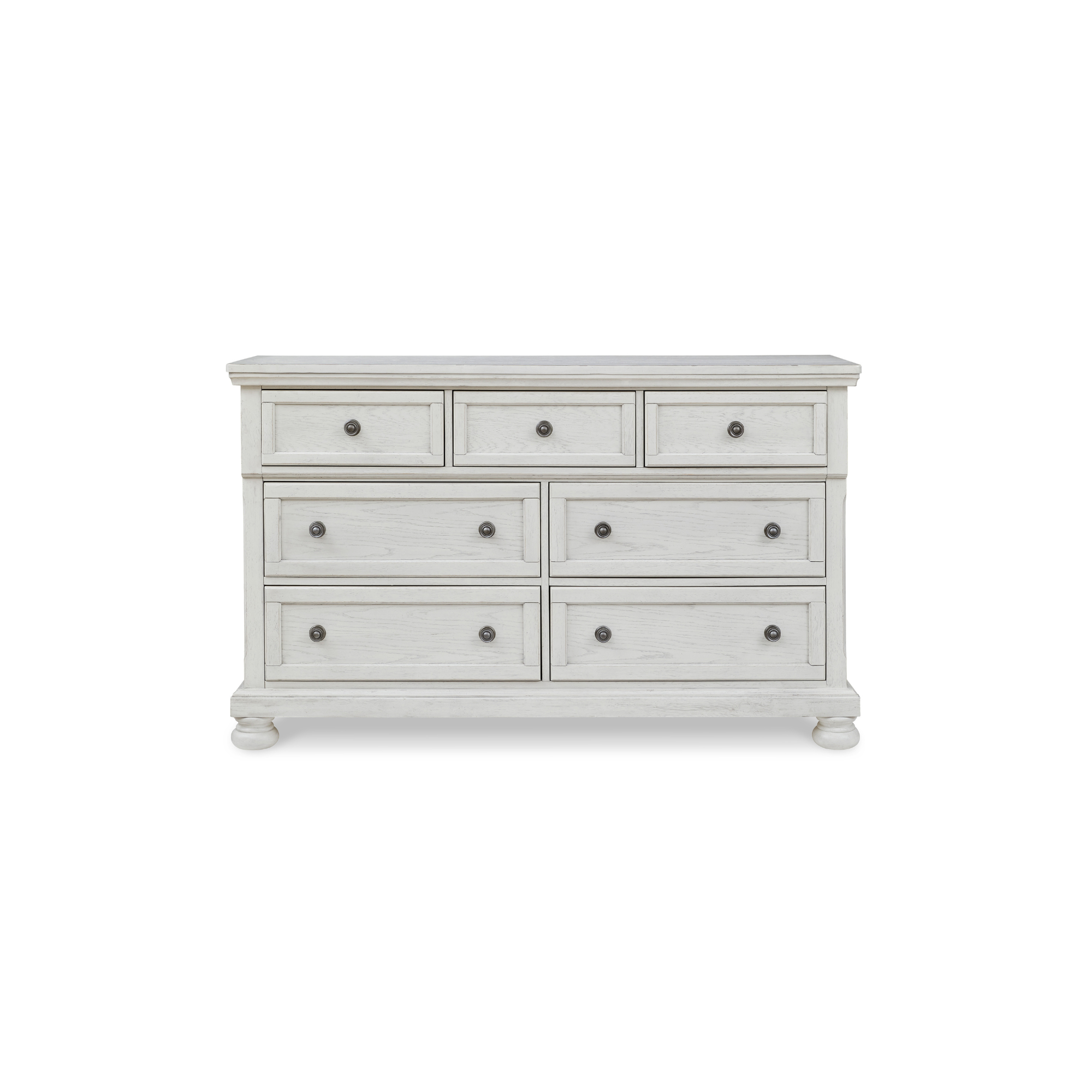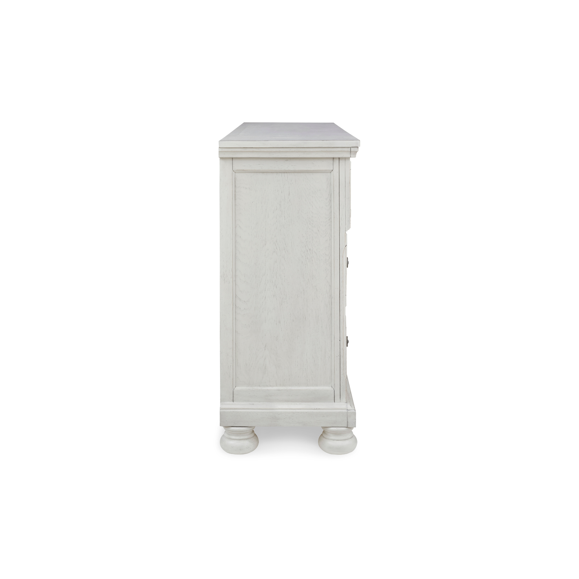 Elegantan i bezvremenski namještaj podiže vašu spavaću sobu na viši nivo. Ništa to ne postiže bolje od Robbinsdale komode. Antički bijela završna obrada s izraženom teksturom drveta odiše profinjenošću, dok tamnobronzane ručkice dodaju ukrasni dodir. Skrivena izvučna ladica iza gornje srednje ladice čuva vaše male dragocjenosti izvan pogleda. Gornje ladice obložene filcom zaokružuju ovu komodu za istinski sofisticiran ugođaj spavaće sobe.