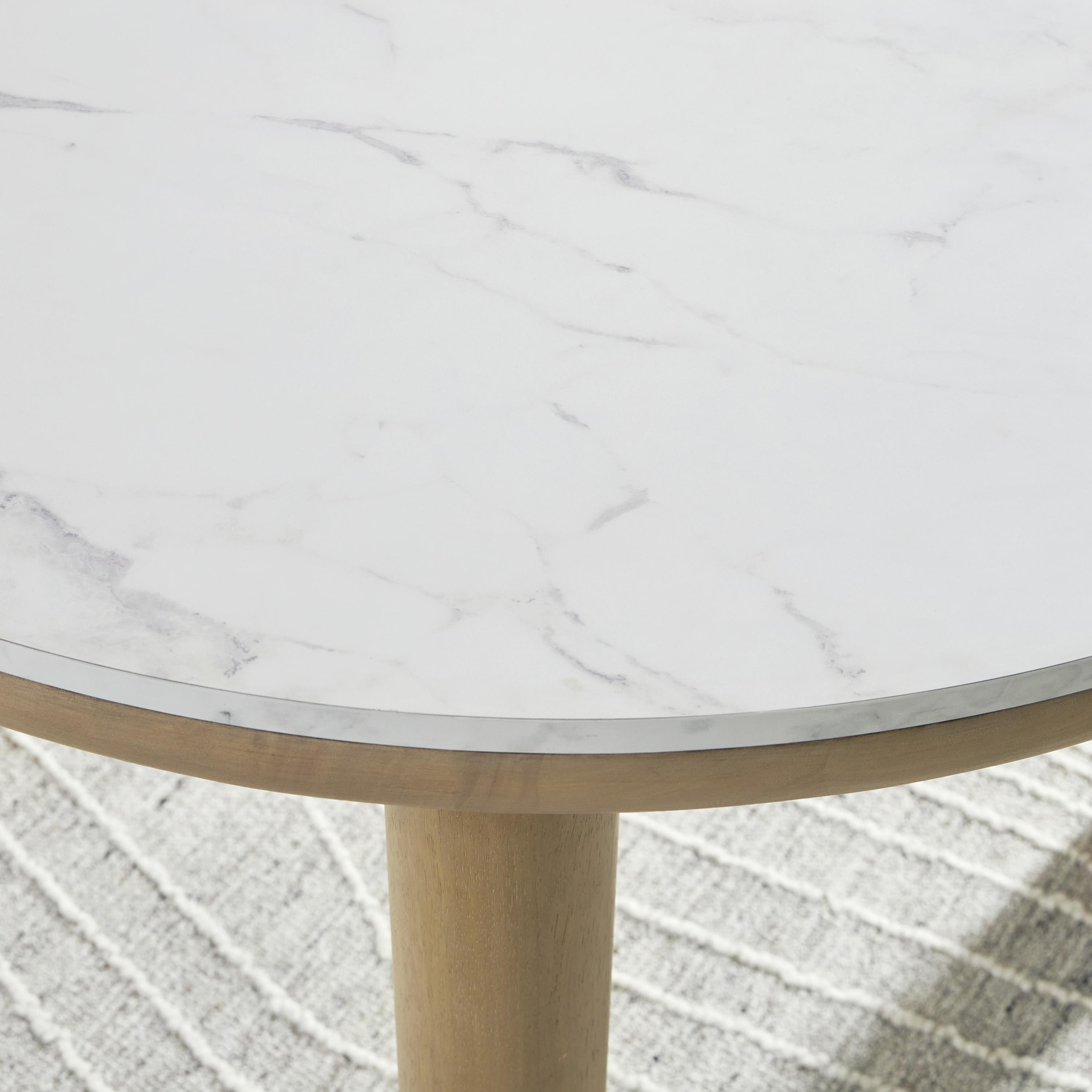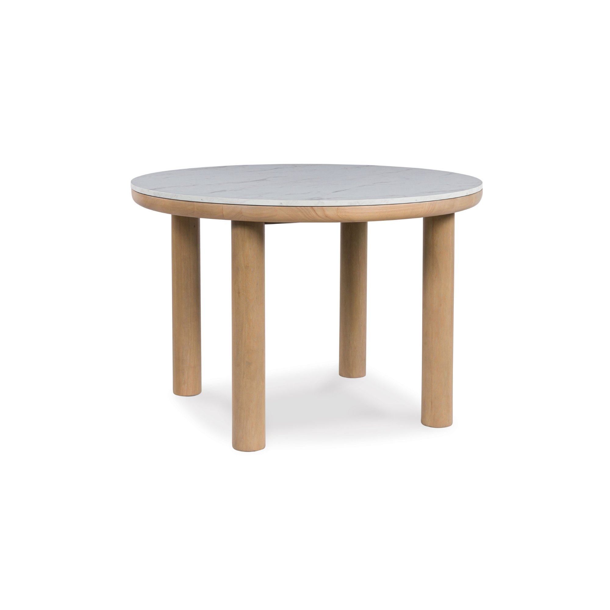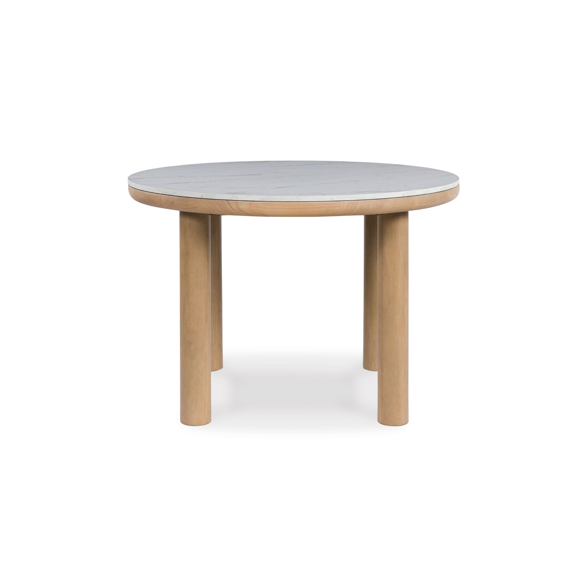 Čiste linije susreću se s glatkim oblinama kod Sawdyn trpezarijskog stola. Debele okrugle noge i prirodni finiš daju moderan izgled, dok vrh stola s imitacijom bijelog mramora zaokružuje ležerni dizajn za svakodnevni život. Sjajan izbor za osvježenje vaše trpezarije.